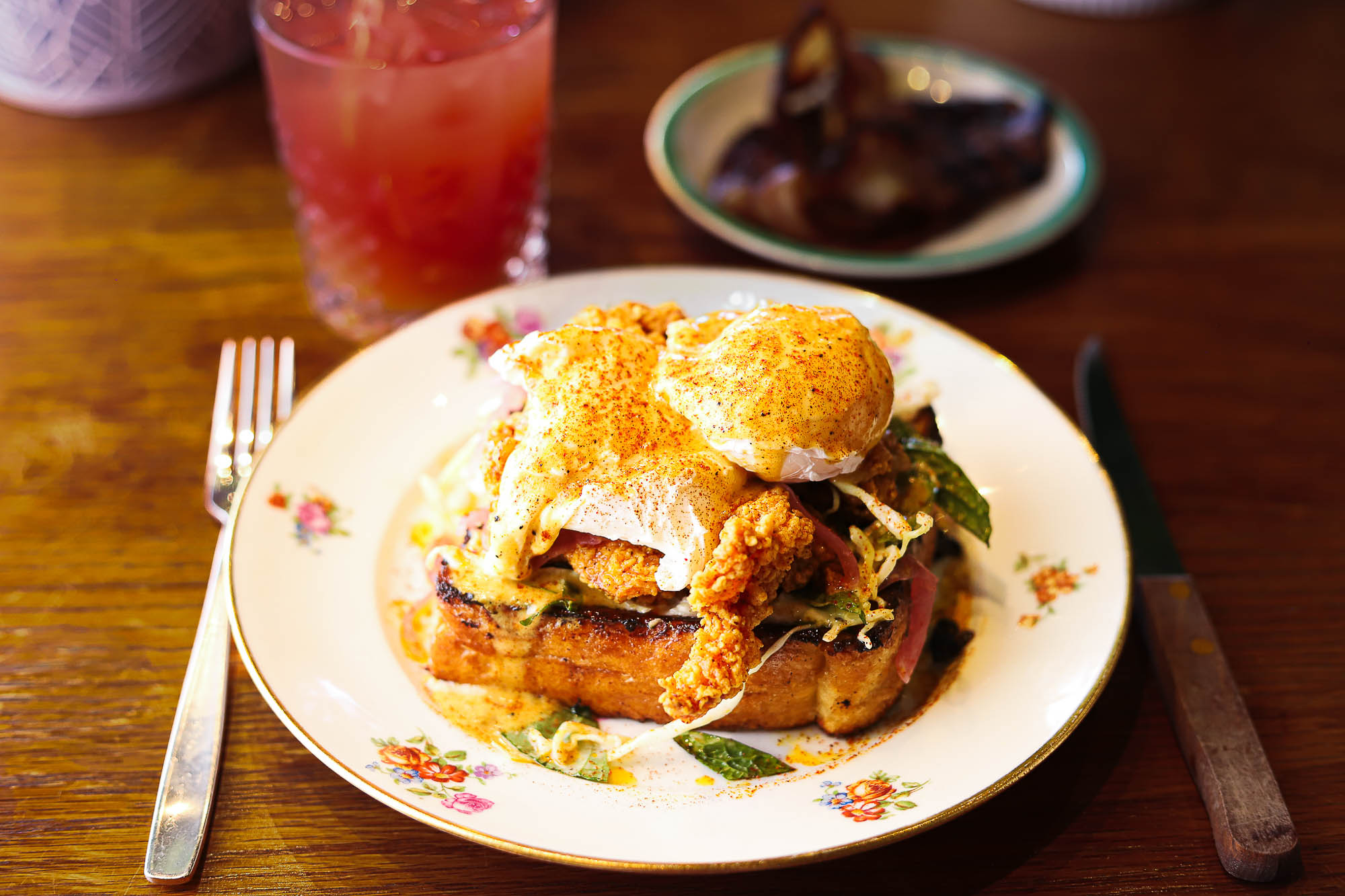 Crispy edges, jammy eggs, brown butter hollandaise , roasted mushrooms, stacked French toast.